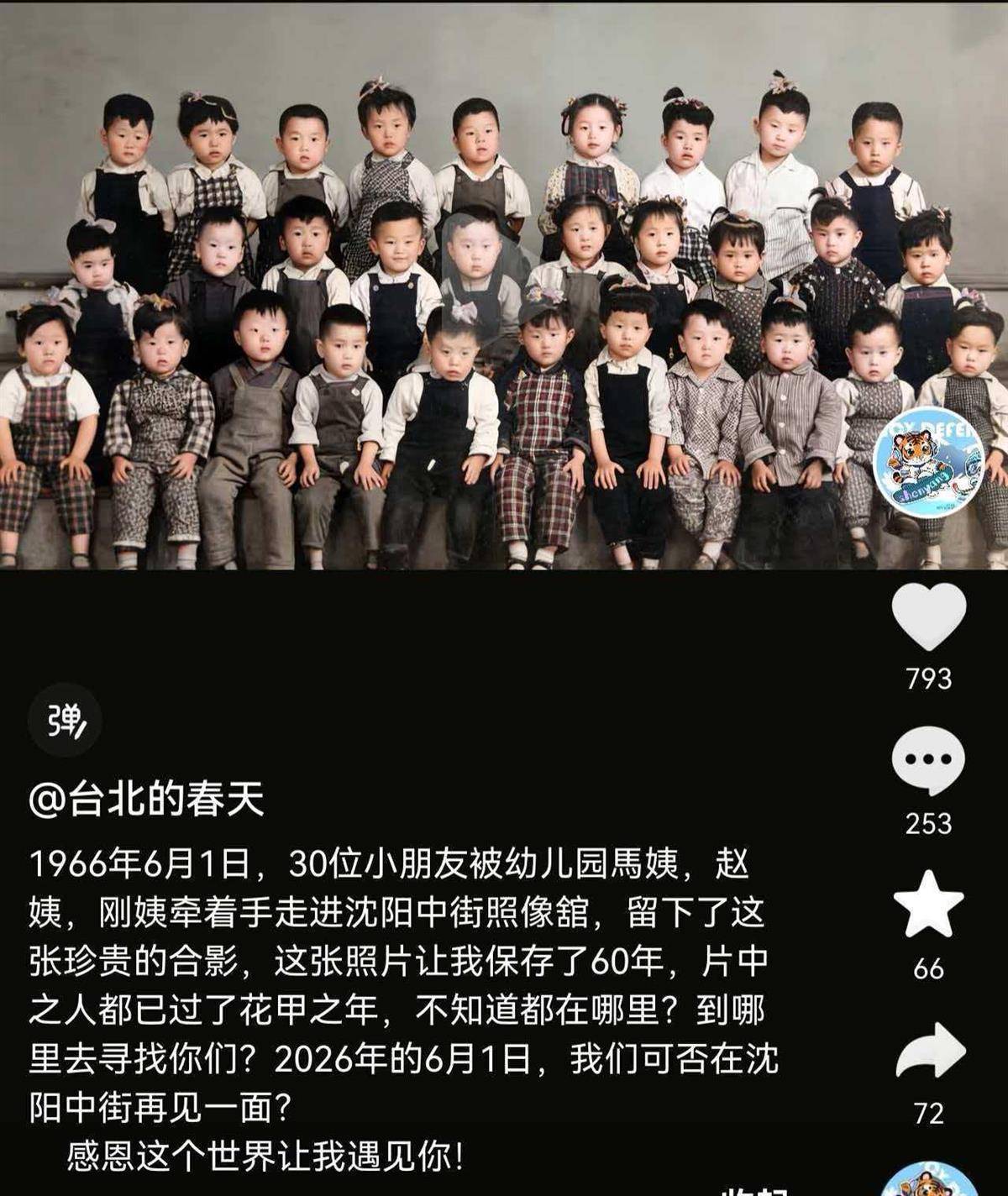 近日,有网友发布了一张1966年6月1日托儿所的珍贵合影,欲寻找片中人:今年的6月1日,正好是60年,可否在沈阳中街再见一面?