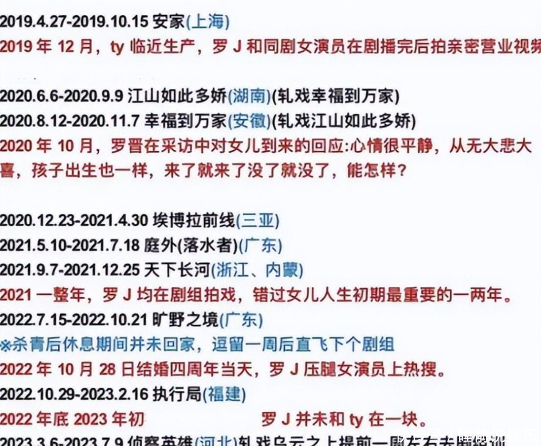所以唐嫣的粉丝认为她和罗晋是不是之间出啥问题了。于是有一位细心的唐嫣粉丝整理了罗晋的一份行程表。虽然不能确定这份行程表到底是否完整吗,但从其中的时间线来看,罗晋似乎真的是有点太忙了。