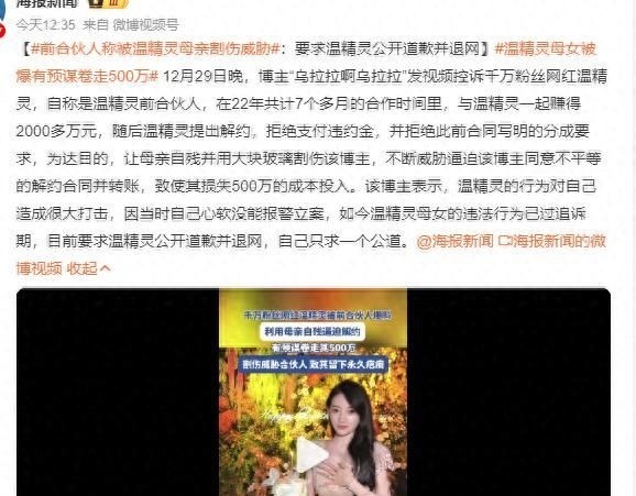 据知情人士透露,此后温精灵在未告知的情况下,在个人视频中影射颜九“表面温柔实则算计”,甚至泄露对方情感隐私。虽事后发文致歉,但措辞模糊,被普遍认为缺乏诚意。